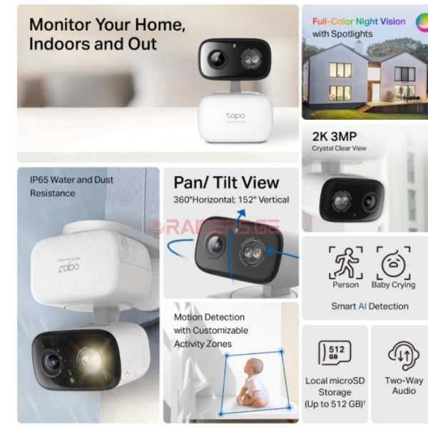 2K QHD • Color Night Vision • Pan/Tilt 360°/114° • AI Person & Baby Detection • 2-Way Audio • Motion Tracking • MicroSD / Cloud • Tapo App • მარტივი მონტაჟი • Privacy Mode |